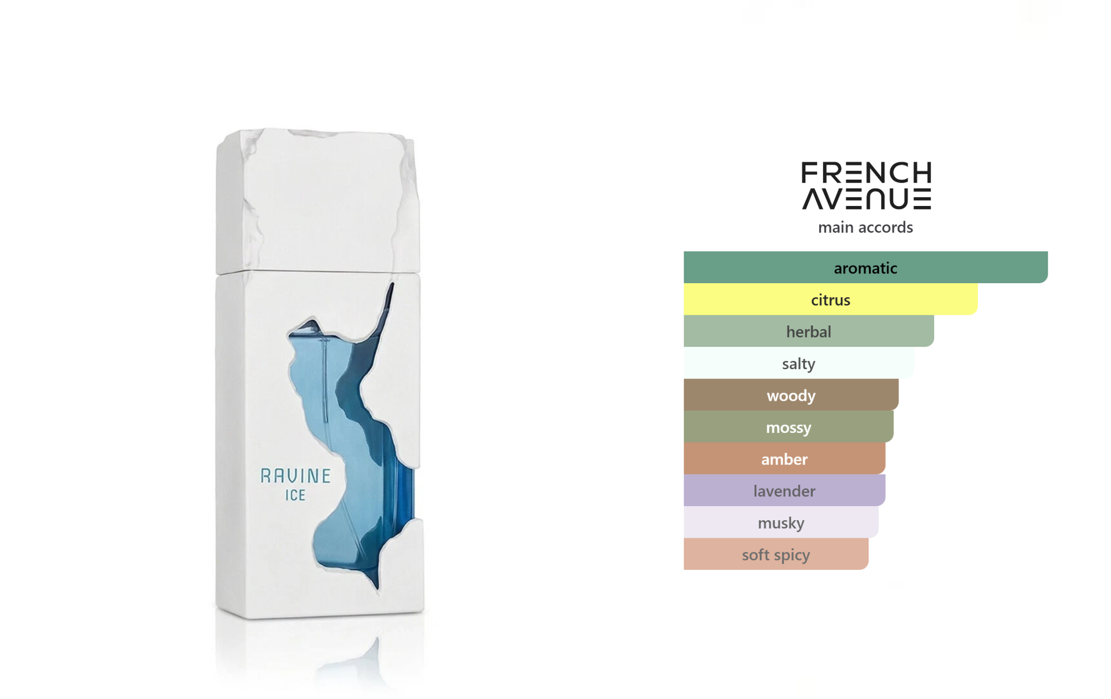 Ravine Ice by French Avenue is a crisp, aquatic fragrance designed to capture the breezy, salt-crusted essence of a rugged coastline. As a popular it opens with a sharp, cooling blast of lemon and geranium before settling into a heart of aromatic sage and a distinct salty marine accord. The base of moss and ambroxan gives it a clean, earthy finish that mimics the smell of sea spray on sun-warmed rocks. It has gained a reputation in the fragrance community for its impressive longevity often lasting 8+ hours making it a reliable, high-performing choice for hot summer days or professional office environments